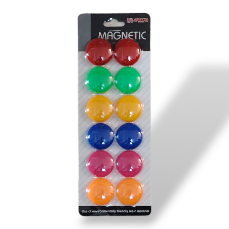 Paquet de 12 boutons de fixation en aimant de couleurs variées de 30mm de diamètre, idéal pour afficher et conserver à portée de mains tous les documents.
